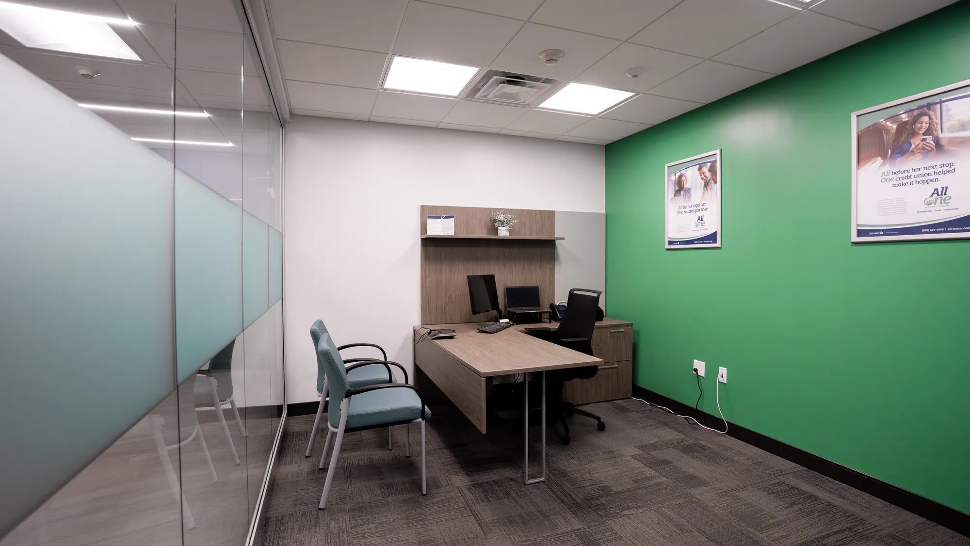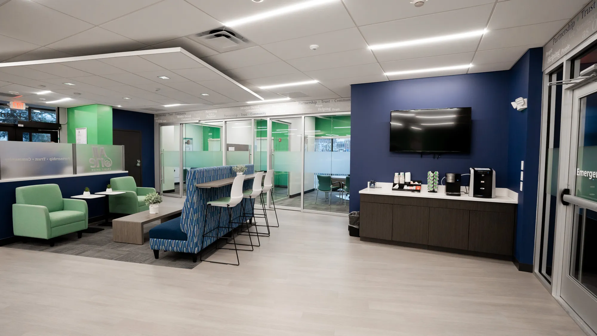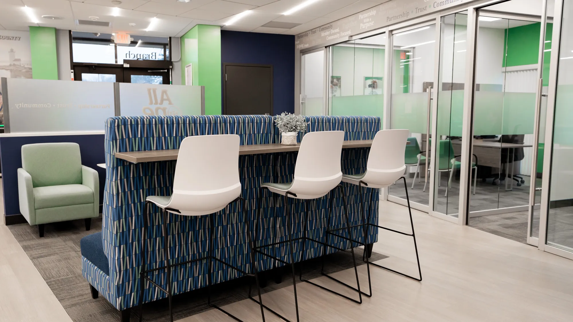 Vibrant brand implementation with custom wall mural, unique furniture configurations, advanced banking technology, and confidential meeting spaces.