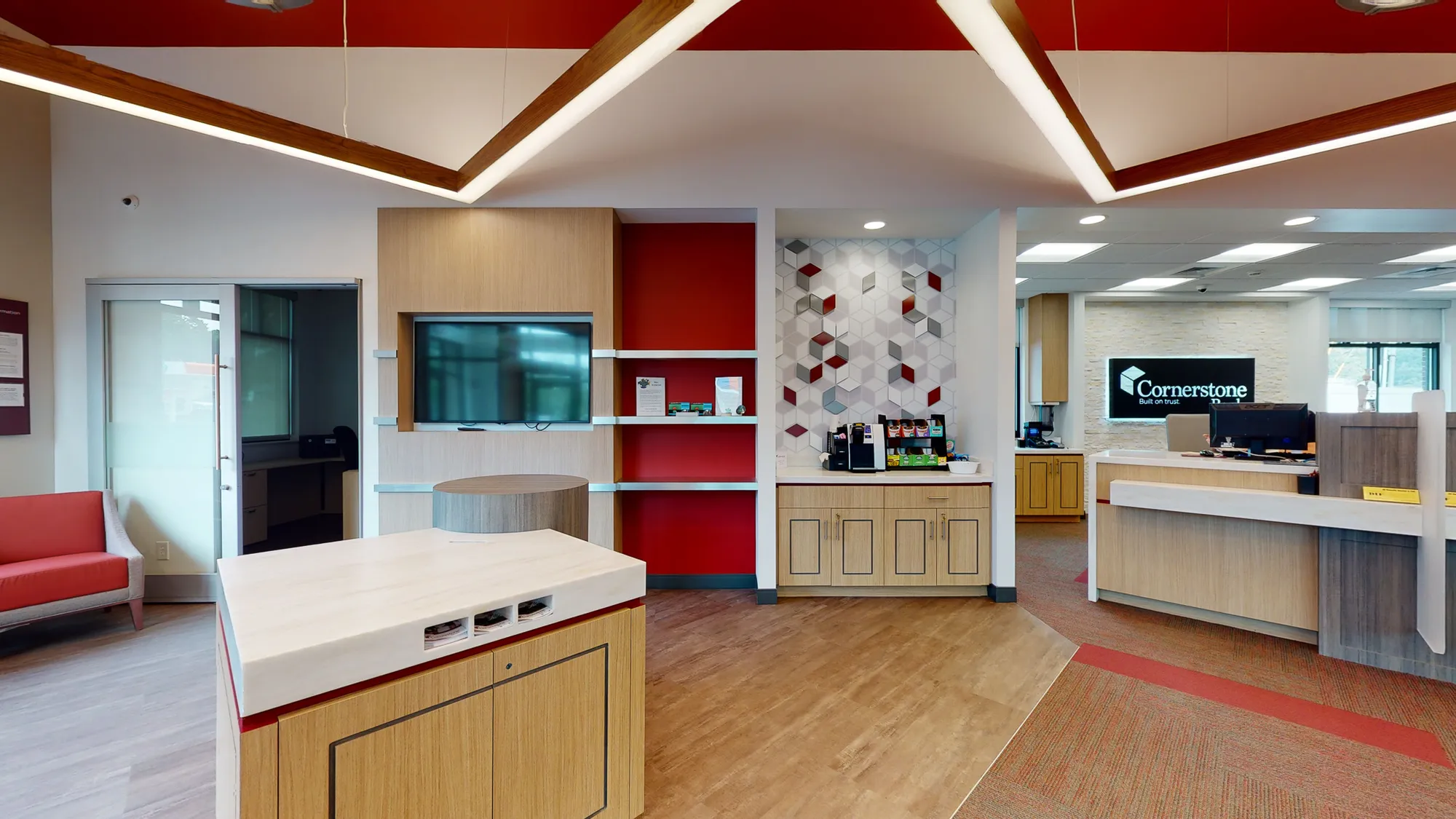 Solidus renovated Cornerstone Bank’s Boylston Street branch in Worcester, Massachusetts, introducing a refreshed design that enhances the customer experience. The vestibule features a custom illuminated logo designed by the Solidus branding team, with programmable lighting that can change colors for holidays and community awareness events. Working with Studio Q Architects, Solidus also helped develop a cohesive design palette and architectural elements to support Cornerstone Bank’s unified brand following its 2017 merger.