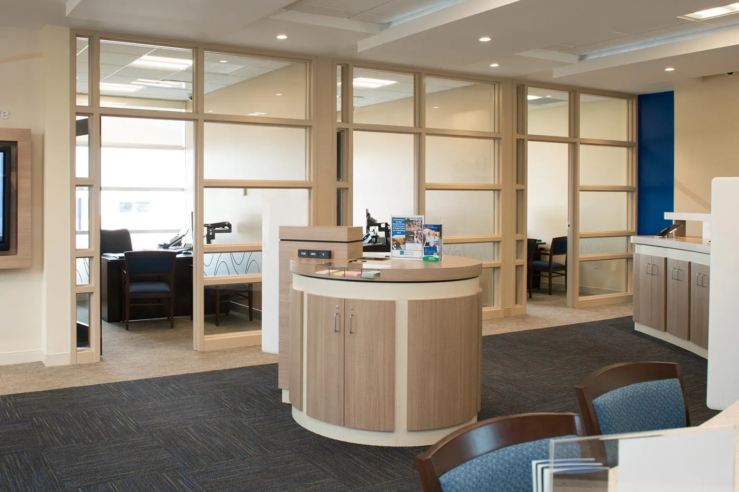 The interior is fitted with dialogue towers and cash recyclers, a tech bar, large graphics and flat screen TVs. The finishes are complementary to the credit union’s branding standards.