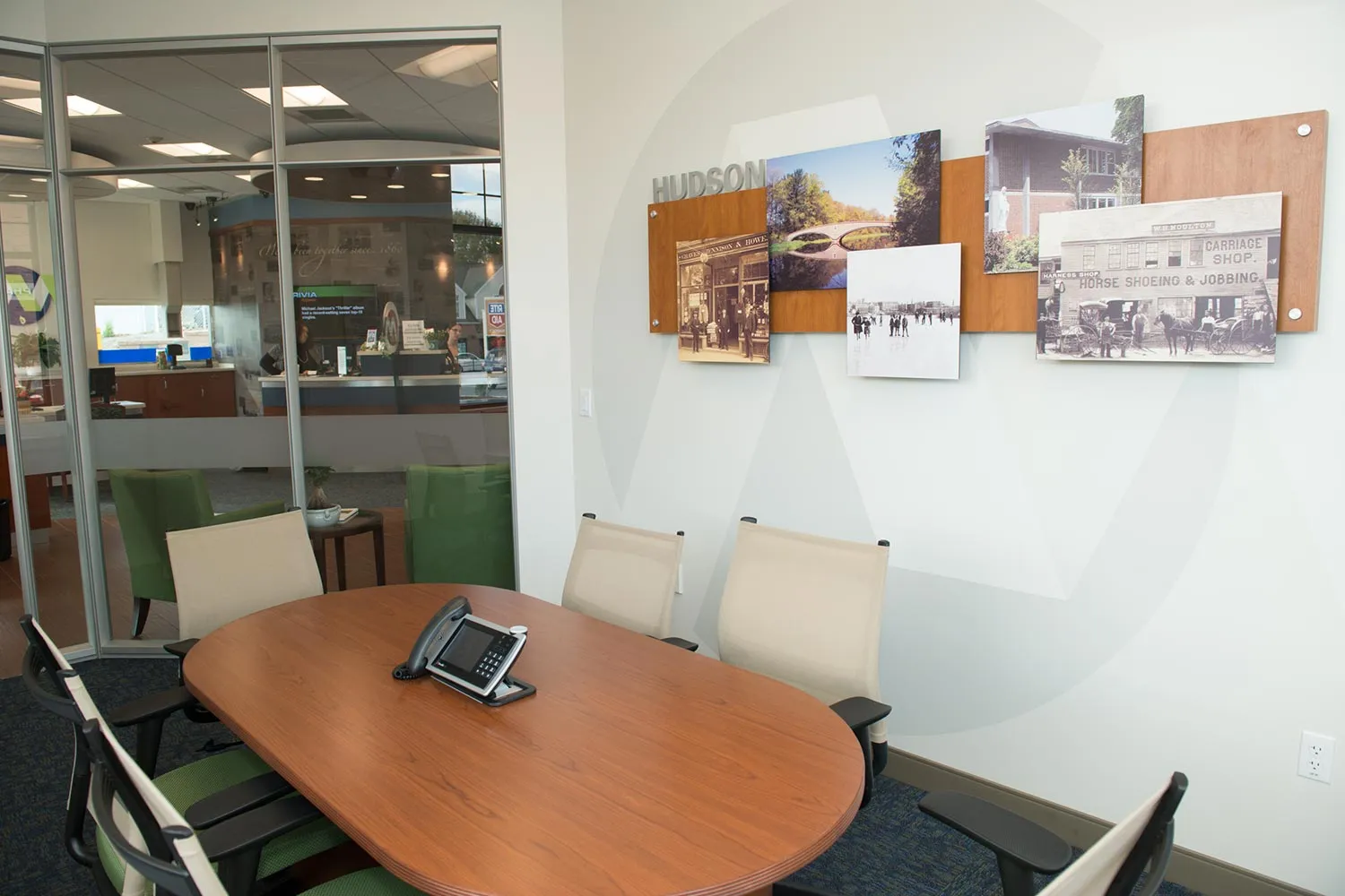 The trademark Marlborough “M” is incorporated into the privacy partitions on the dialogue towers, while other signature elements include a graphic wall depicting the bank’s history and a flat screen TV.