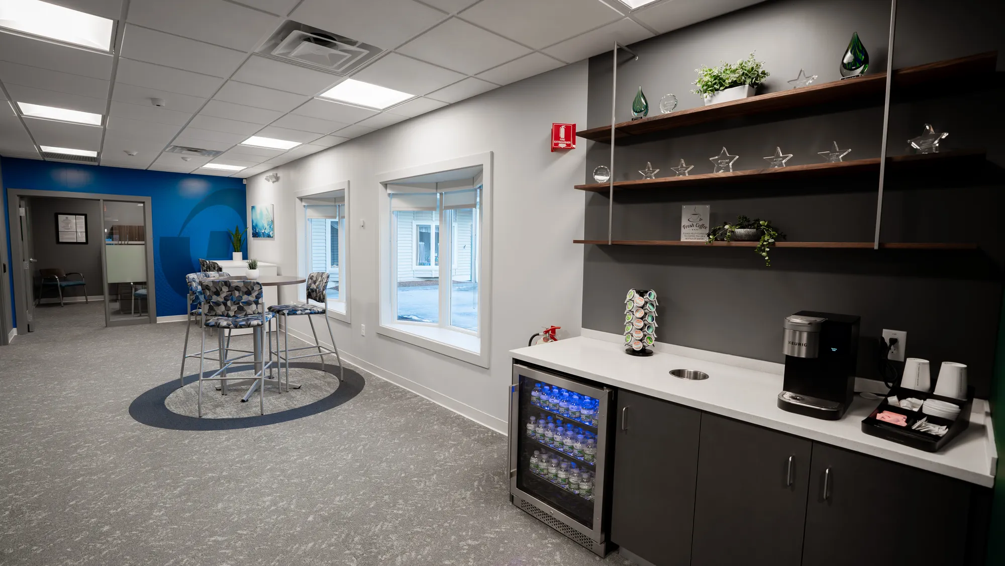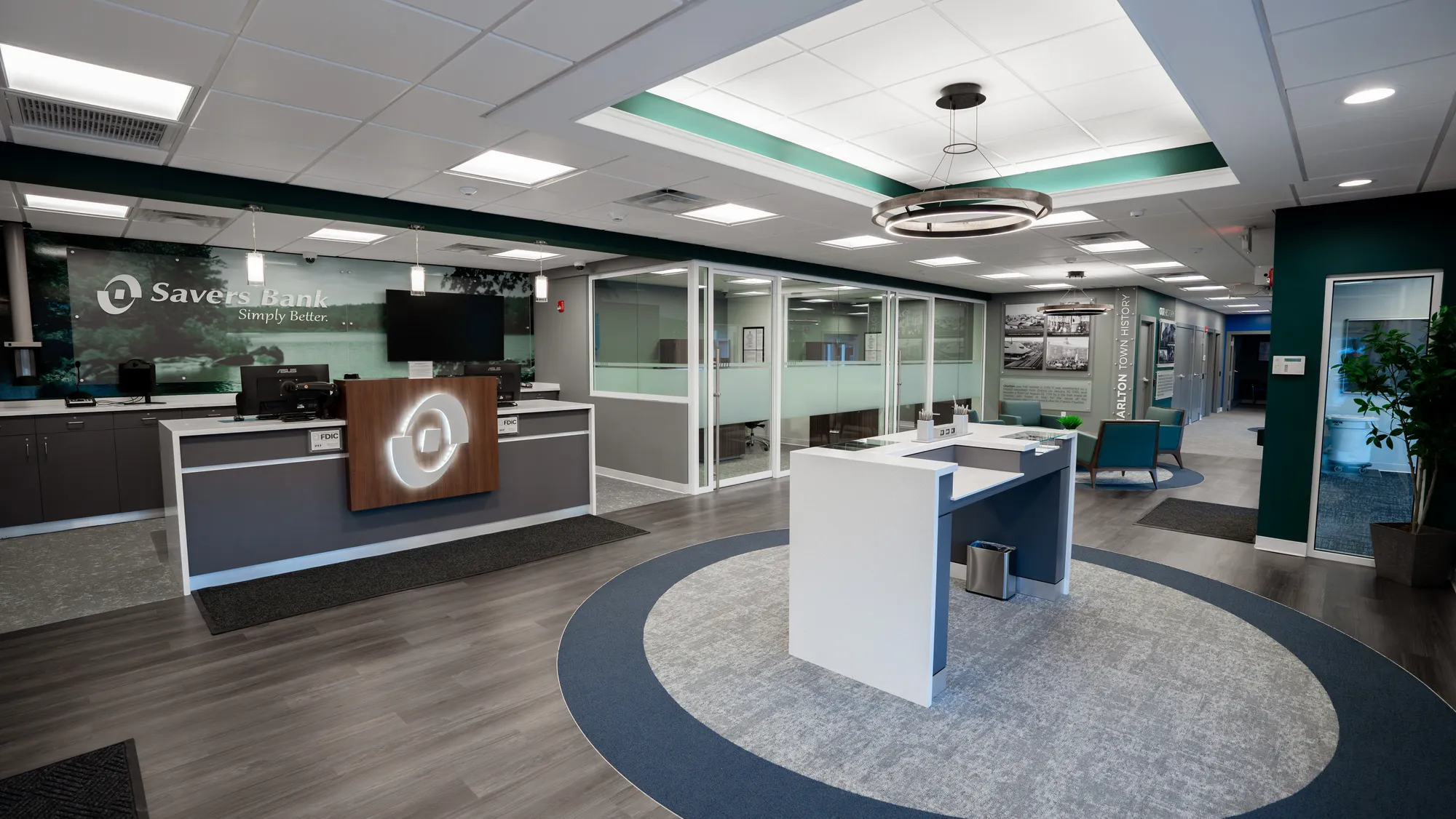 Branch transformation including consultative offices, conference rooms, teller pods, illuminated branding, and elevated furnishings.